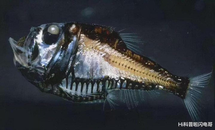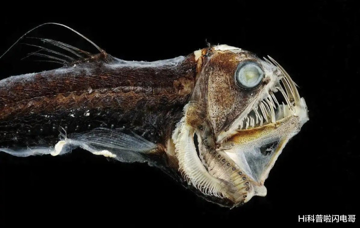 毒蛇鱼长得就像深海版吸血鬼,牙齿长到从嘴里伸出来。深海龙鱼更狠,眼睛下面有个红色的"激光瞄准器"。由于大部分深海鱼都看不见红光,所以它能悄悄锁定目标,然后一击必杀。