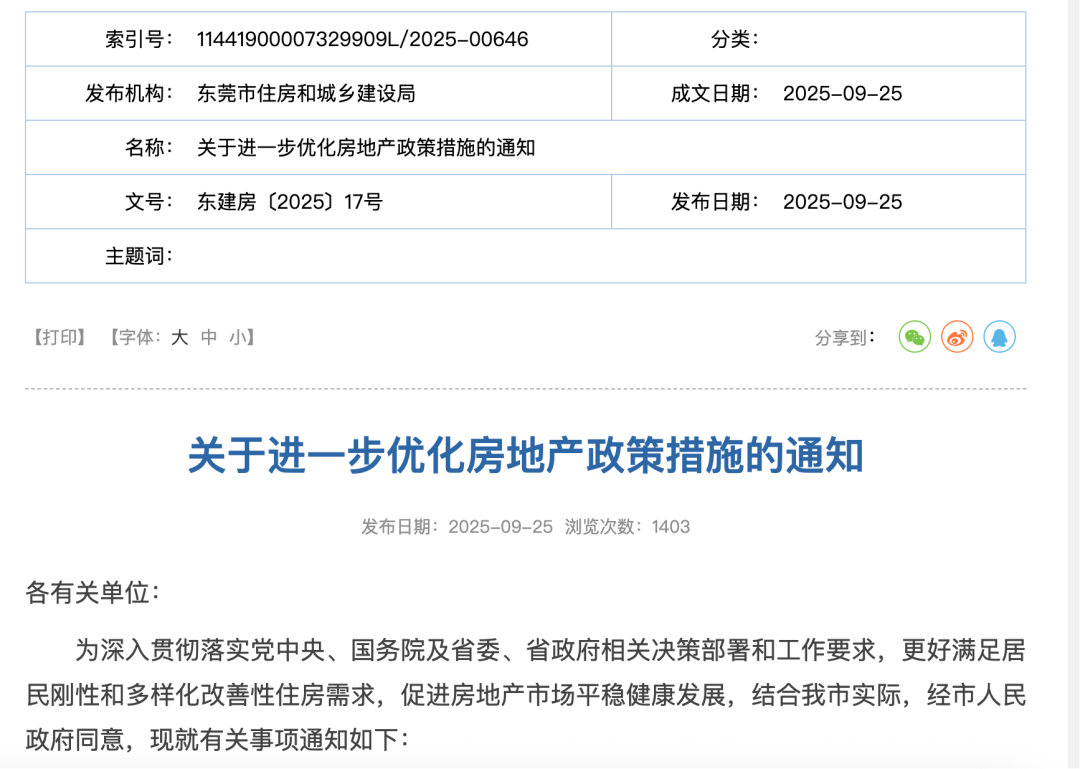9月25日,东莞市住房和城乡建设局等六部门联合印发了《关于进一步优化房地产政策措施的通知》(以下简称“通知”),从六个方面提出了提振需求和优化供给的举措。